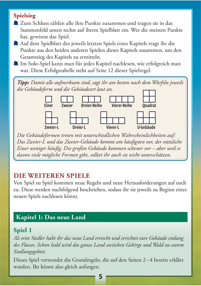 Zuerst legt jeder Spieler ein Spielblatt vor sich aus und nimmt die Würfel bereit. Danach wird die erste Runde eingeläutet, indem die Würfel geworfen werden, um die Form und Art der Gebäude zu bestimmen.