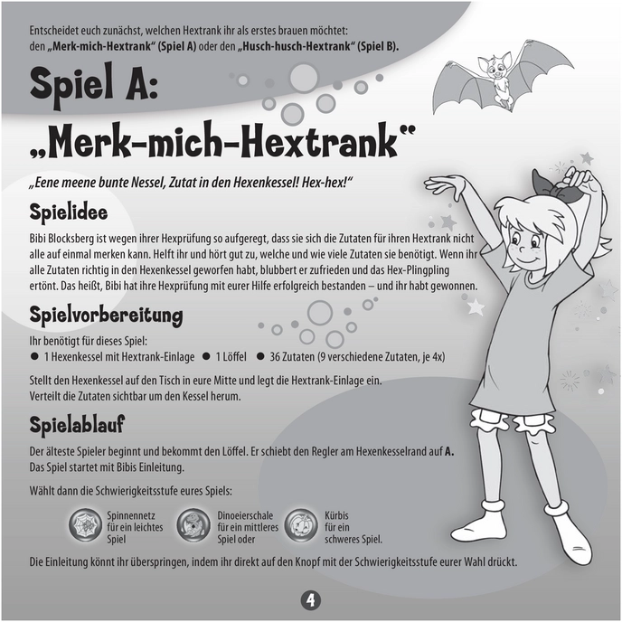 Nutzen Sie beispielsweise die Spielanleitung zu Bibi Blocksberg Der blubbernde Hexenkessel, um direkt in ein magisches Merkspiel einzutauchen, oder entdecken